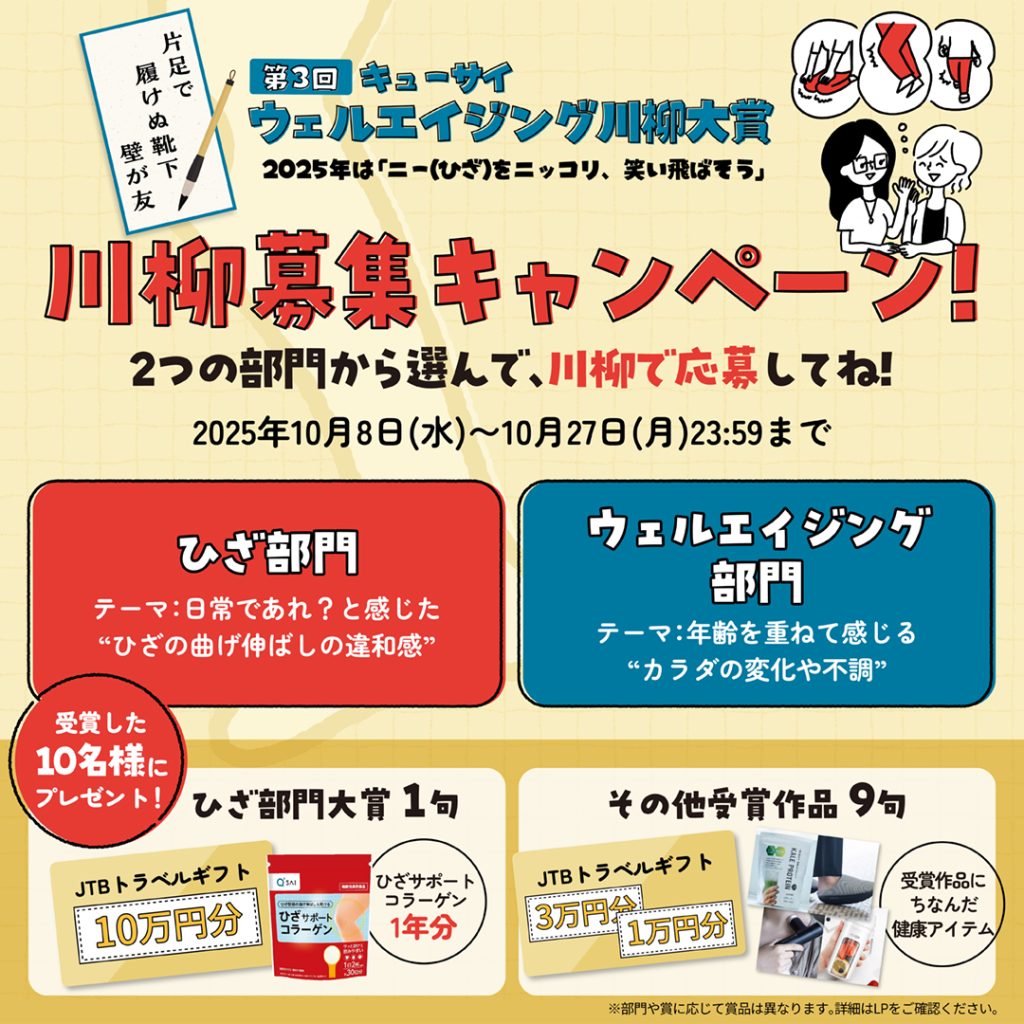 『第3回キューサイウェルエイジング川柳大賞』10月8日募集開始!受賞作品には最大10万円分の旅行券をプレゼント。2025年は「ひざ部門」を新設し、くすっと笑える作品大募集!