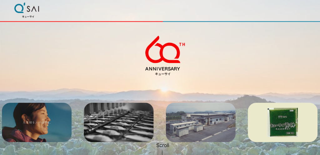 キューサイ株式会社(本社:福岡市中央区、代表取締役社長: 石川 順朗)は、1965年の創業から今年10月1日で60周年を迎えます。この記念すべき節目にあたり、創業60周年記念特設サイトを本日オープンいたしました。特設サイトでは、60周年を記念して策定した企業ロゴや社員インタビューに加え、日頃のご愛顧に感謝を込めたお得なキャンペーンもご案内いたします。今年還暦を迎える「ウェルエイジングカンパニーNo.1」を目指すキューサイが、会社としても大切な節目を機に、これまでもこれからも、お客さまの健やかな未来のために挑戦を続けてまいります。この記念すべき1年を通じて、さまざまな企画を予定しておりますので、ぜひご期待ください。