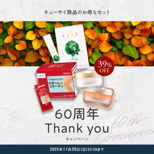 日頃のご愛顧に感謝を込めて、本日9月24日(水)からはキューサイ商品がお得にお買い求めいただけるキャンペーンが開始します。今後も限定商品の販売やプレゼント企画などを予定しておりますので、キャンペーンの最新情報は特設サイトでご覧ください。