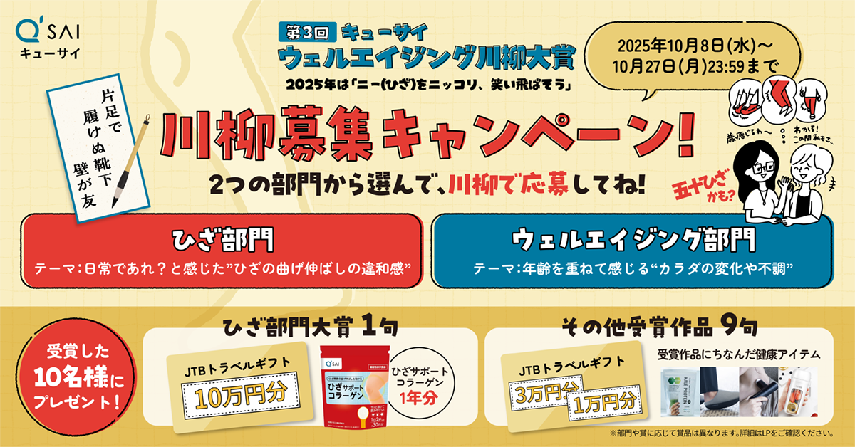 キューサイ株式会社(本社:福岡市中央区、代表取締役社長:石川 順朗)は、毎年2000件以上に上る応募で大変好評いただいている『キューサイウェルエイジング川柳大賞』の第3回を10月8日(水)より開始いたします。2025年は『ニー(ひざ)ニッコリ』にかけて【ひざ部門】を新設し、ご自身が年齢を重ねることで感じる「カラダの変化や不調にまつわるあるある」などの作品を募集いたします。