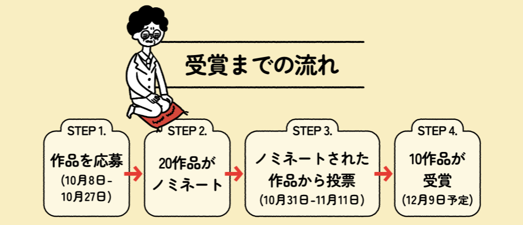 応募いただいた作品の中から、厳正な審査のうえ20作品を選定し、一般投票を経た後、大賞を決定いたします。